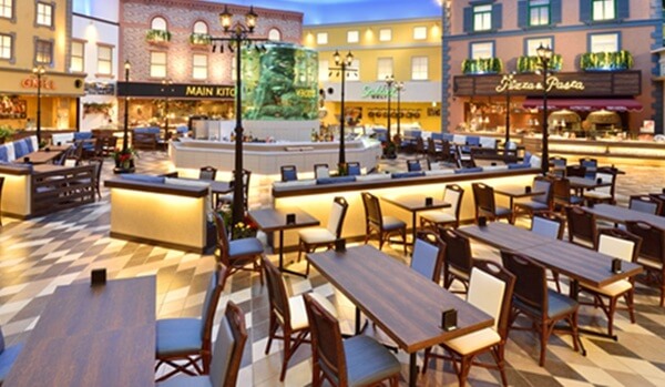 レストランに入ると、巨大水槽で泳ぐたくさんの魚たちがみなさまをお出迎え。イタリア・ナポリの街並みを思わせる開放感あふれる店内で洋食・中華を中心に幅広い品揃えを、好きなものを好きなだけ味わえます。