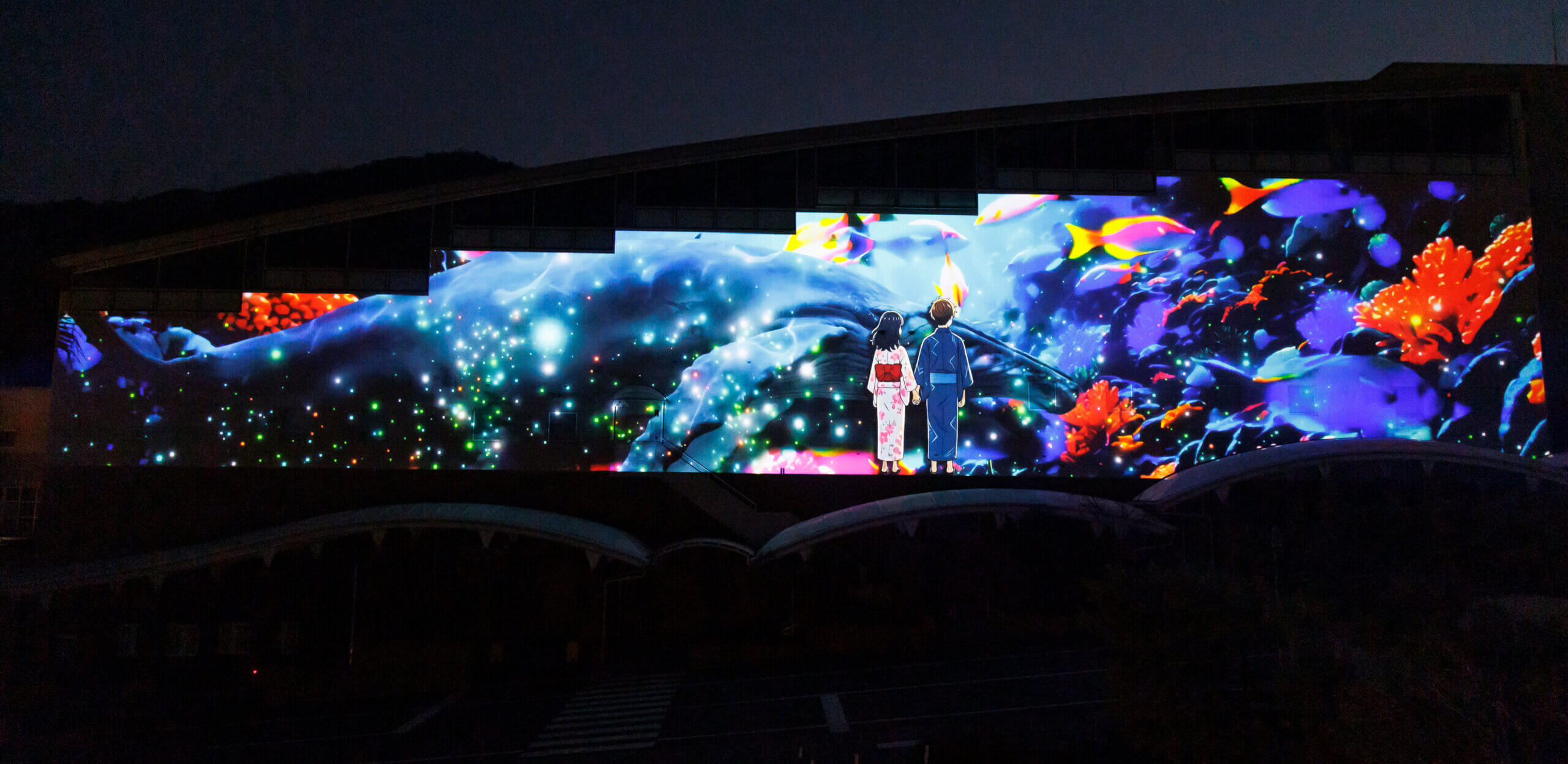 屋外壁面をスクリーンにした、迫力あるプロジェクションマッピング。