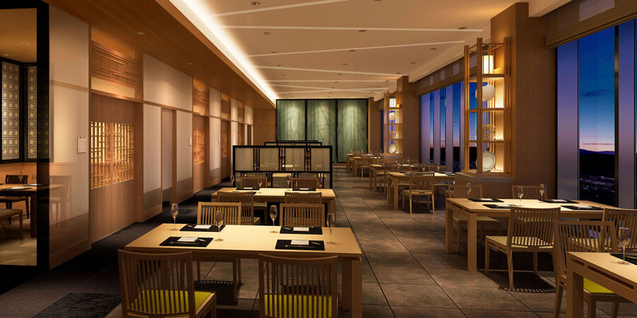 「和料理彩」は杉乃井ホテル星館の12階に位置し、窓からは別府湾の景色を一望いただけます。夕暮れから夜の街明かりへ。お食事とともに移りゆく景色が、ひとときに彩りを添えます。店内の空間にも、別府・大分の伝統が息づいています。別府の竹細工や、大分県の焼き物「小鹿田焼(おんたやき)」を取り入れ、素朴で力強い風合いが、自然の温もりと土地の息吹を添えています。